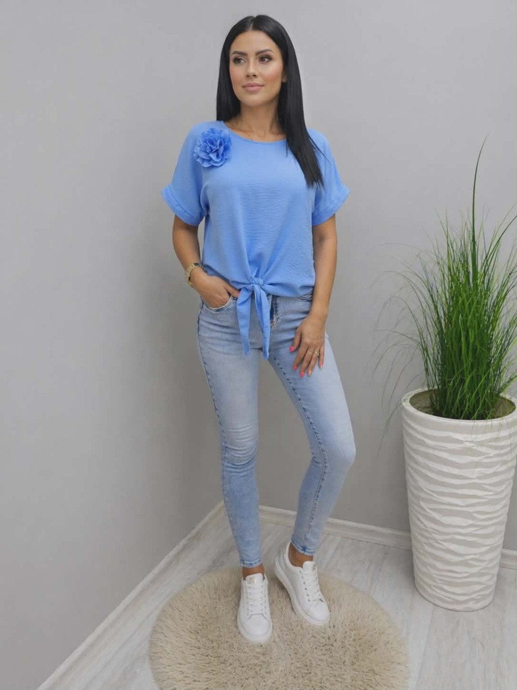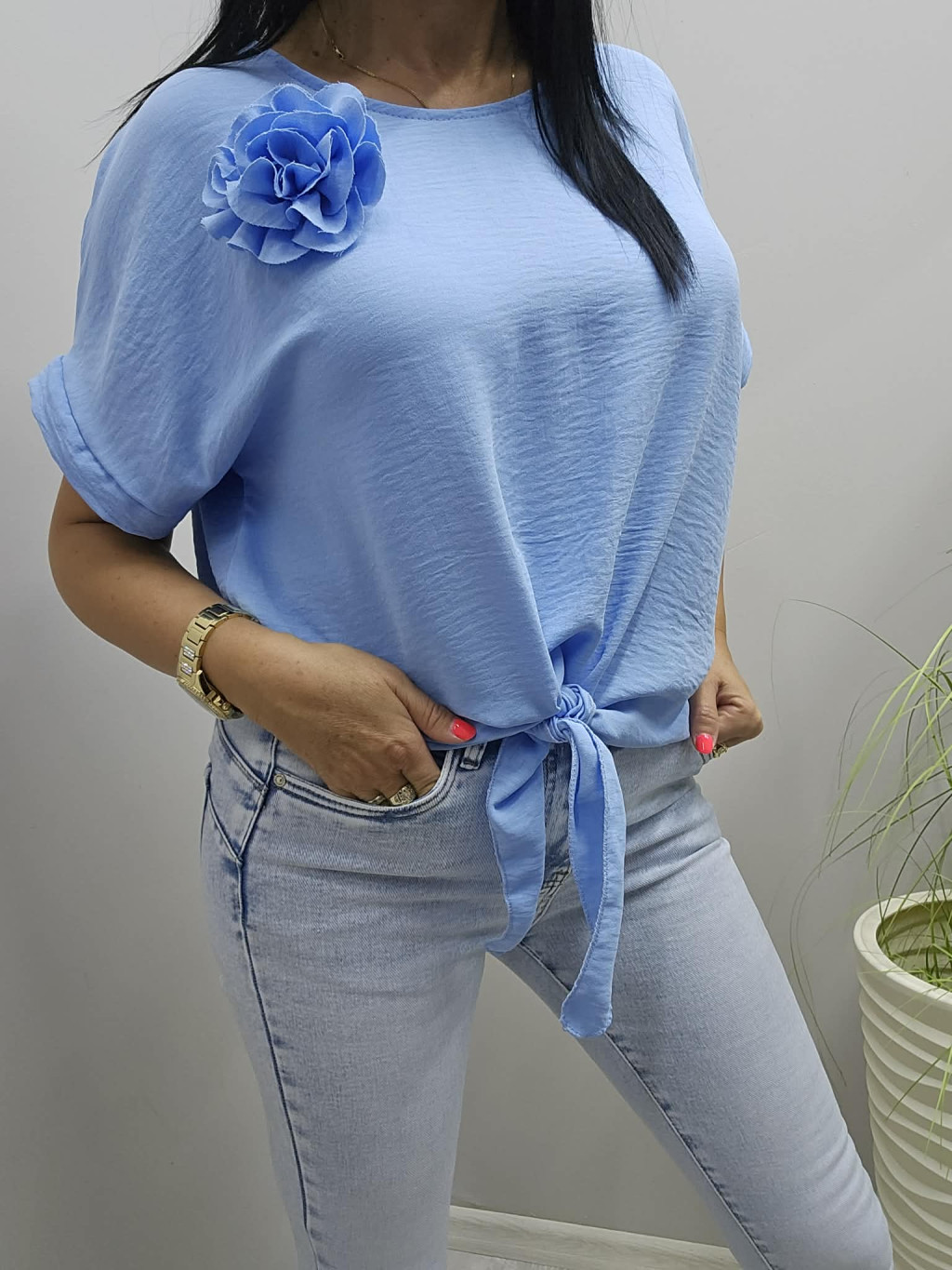 Csinos alján megkötős blúz virágos kitűzővel (kék)