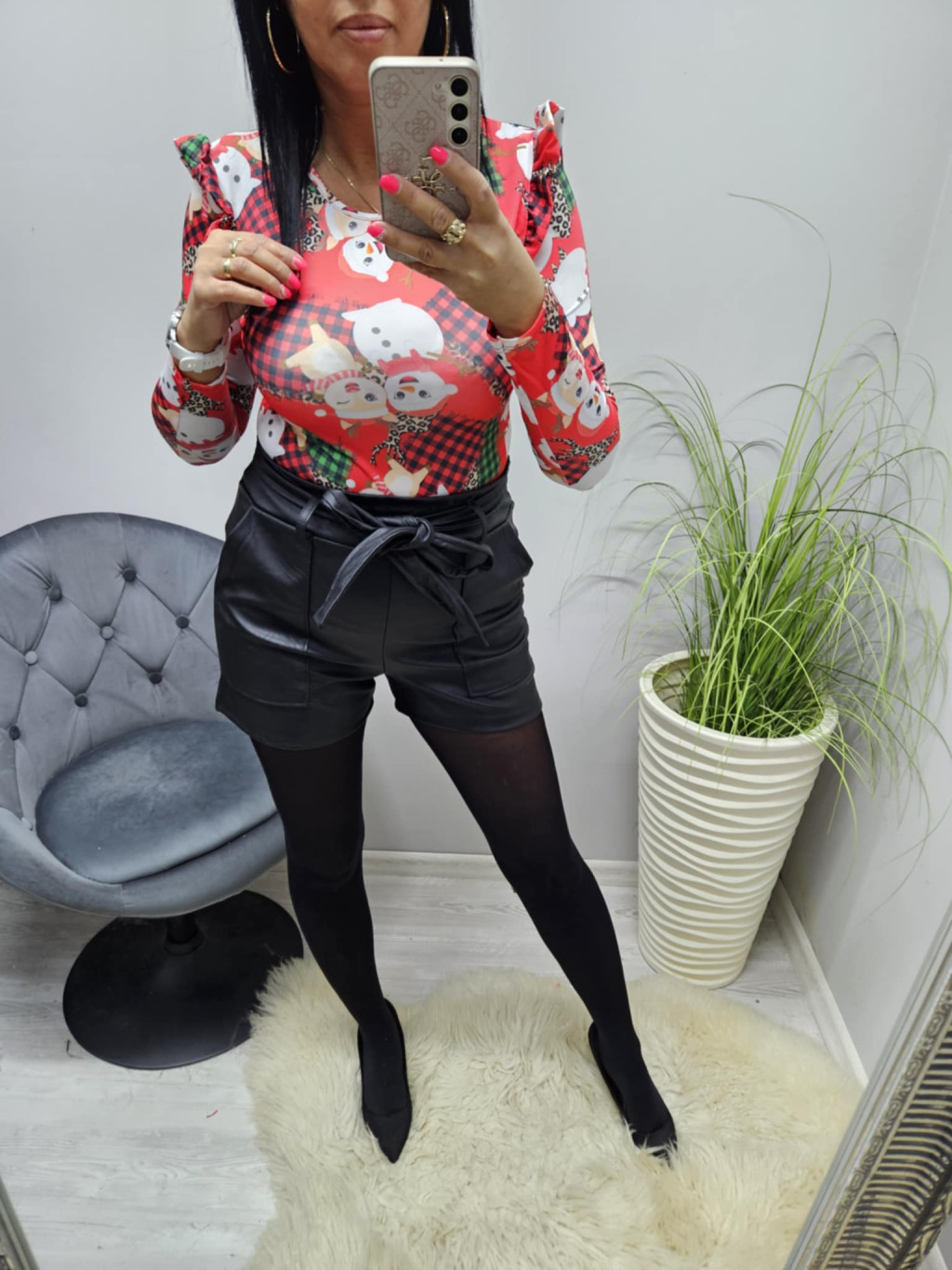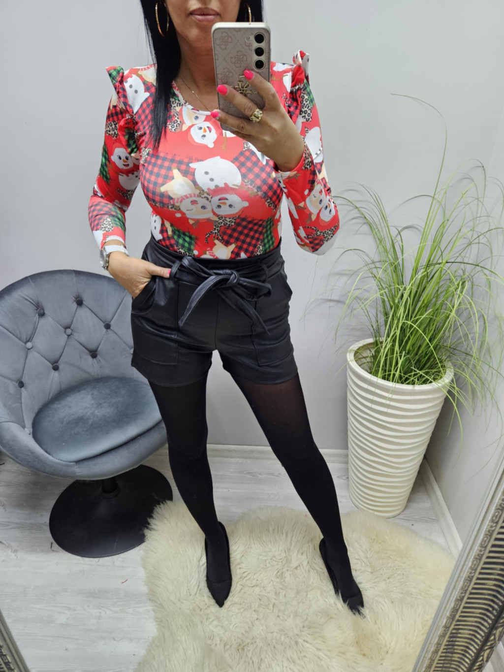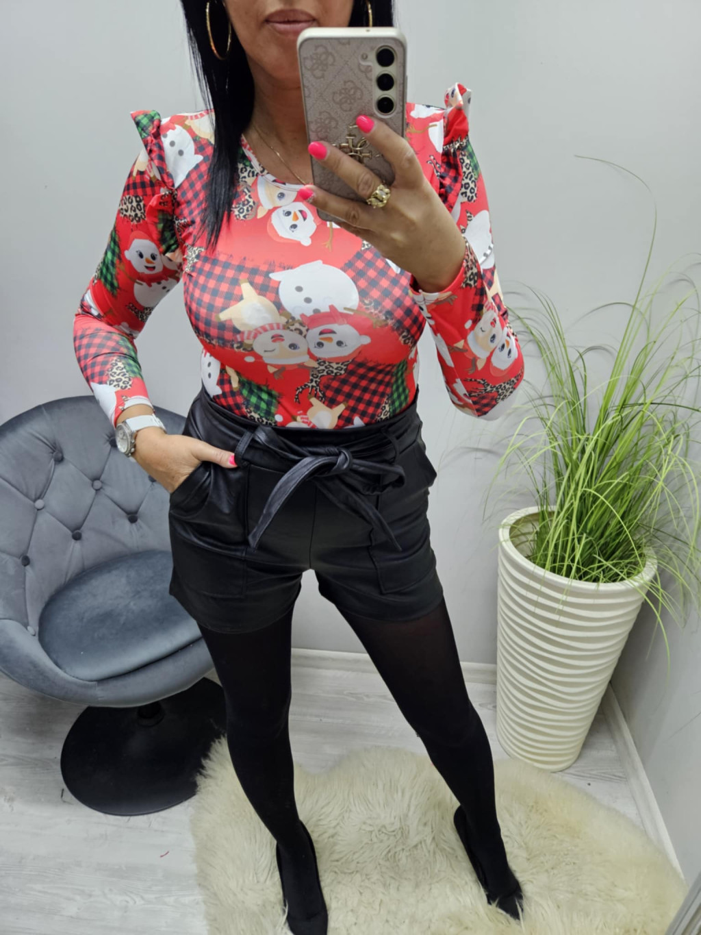 Csinos karácsonyi mintás fodros vállú felső