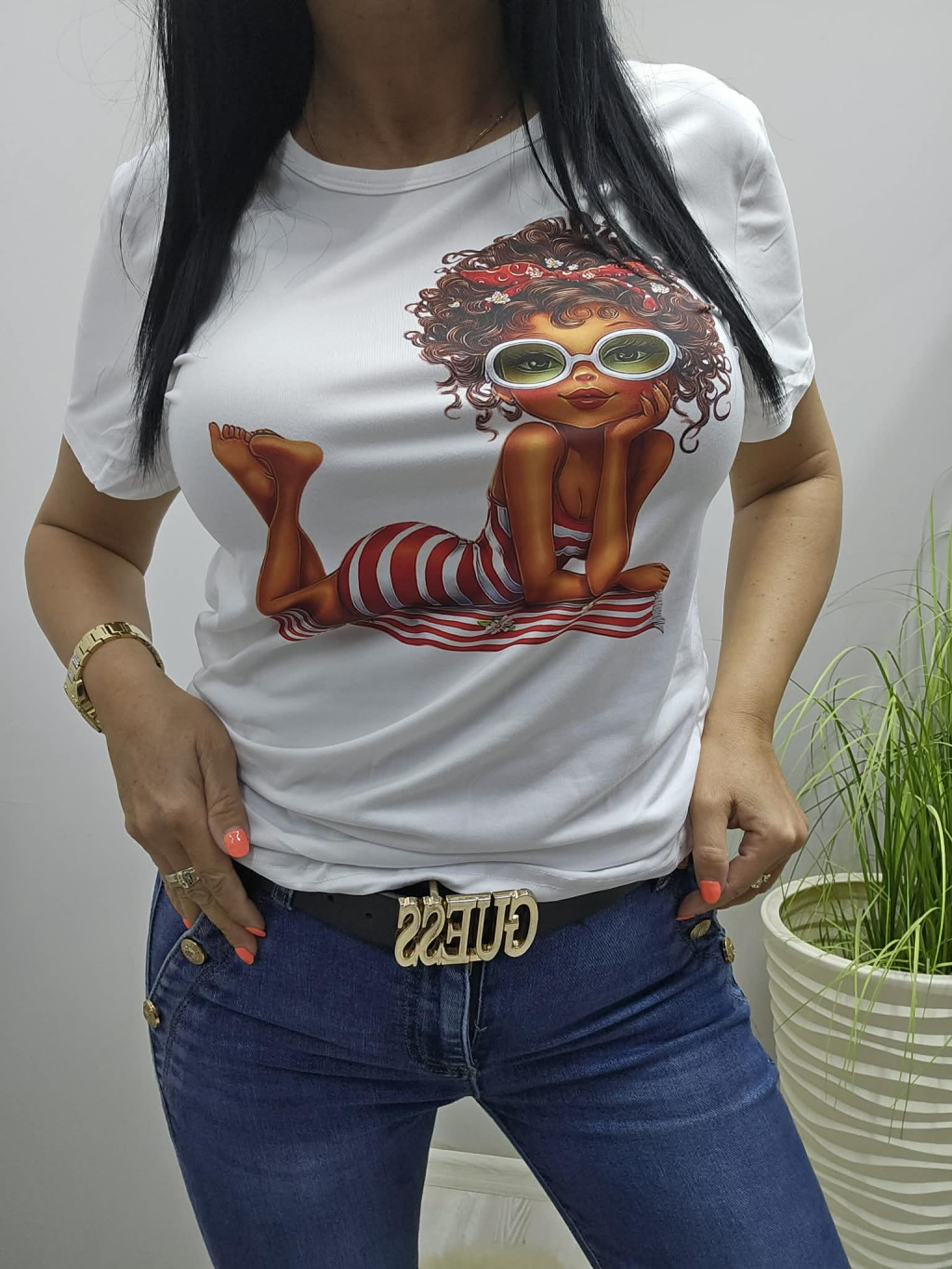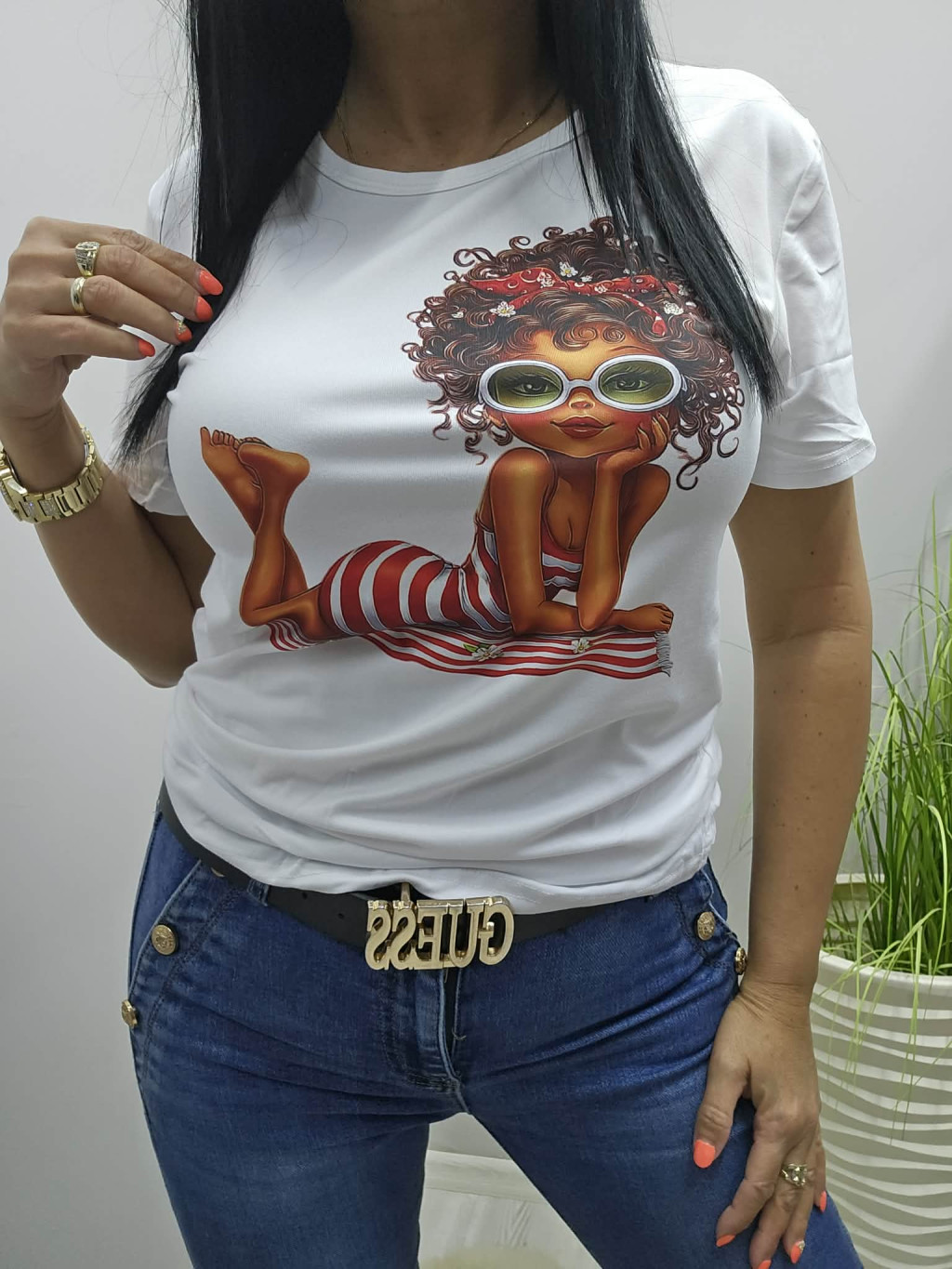 Csinos lány napszemüvegben mintás póló