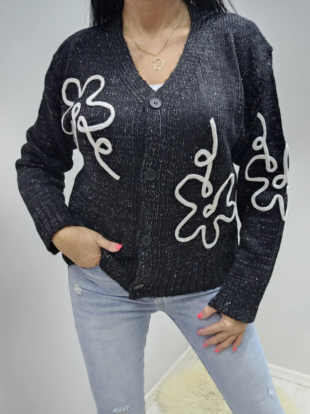 Csinos virágmintás gombos kardigán (cirmos fekete)