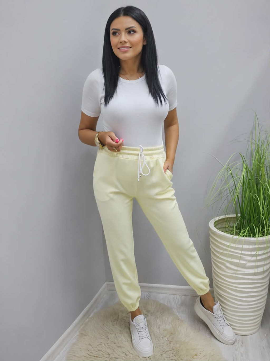 Divatos derekán gumírozott szabadidő nadrág (sárga)