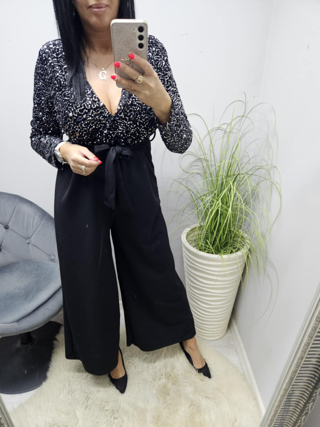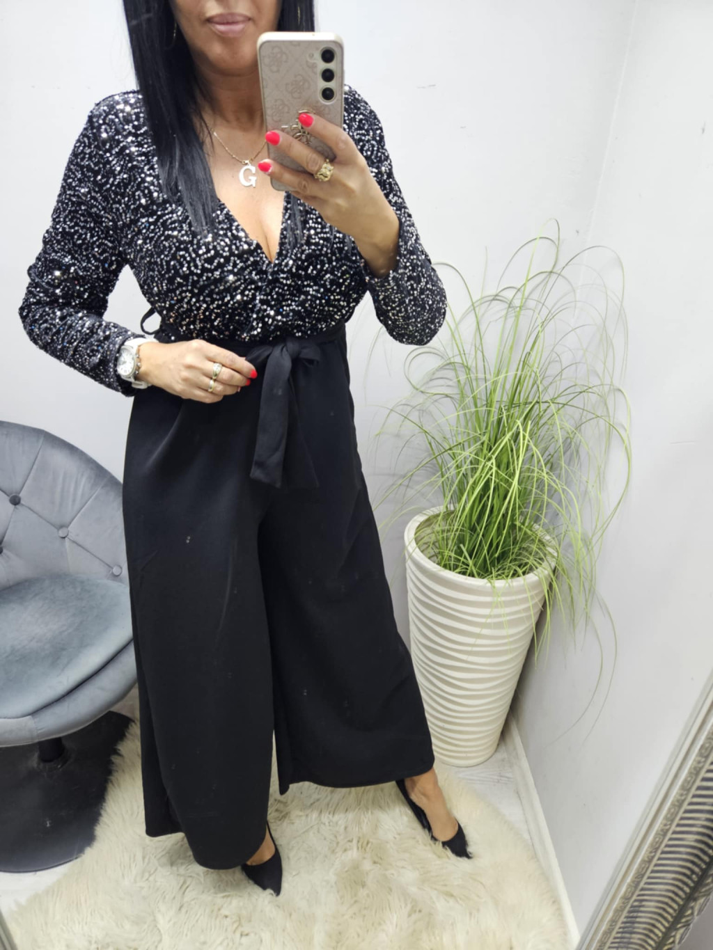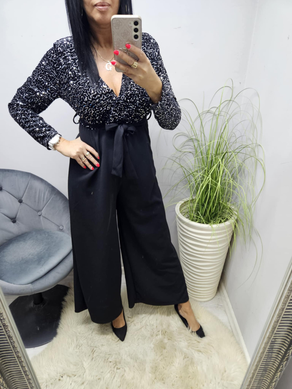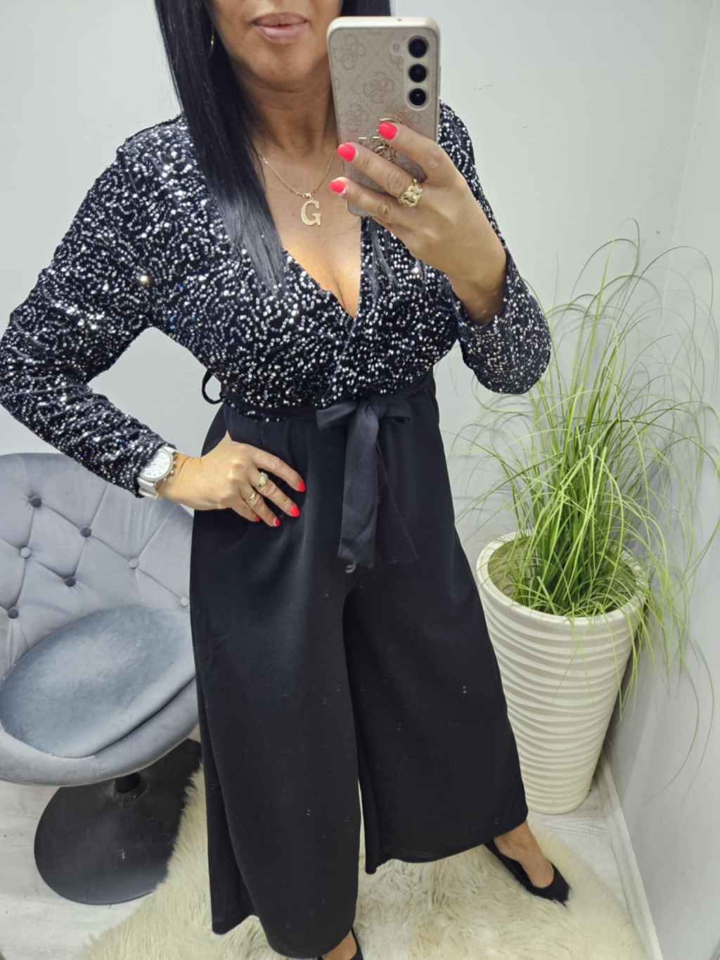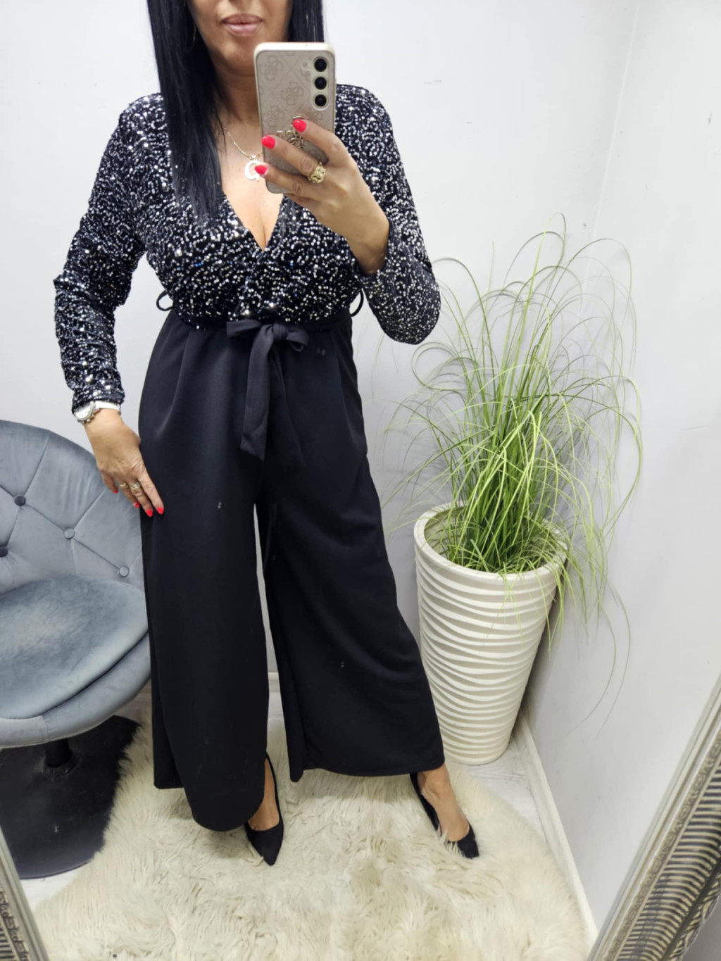 Gyönyörű flitteres mellrészen átlapolt megkötős overál (fekete)
