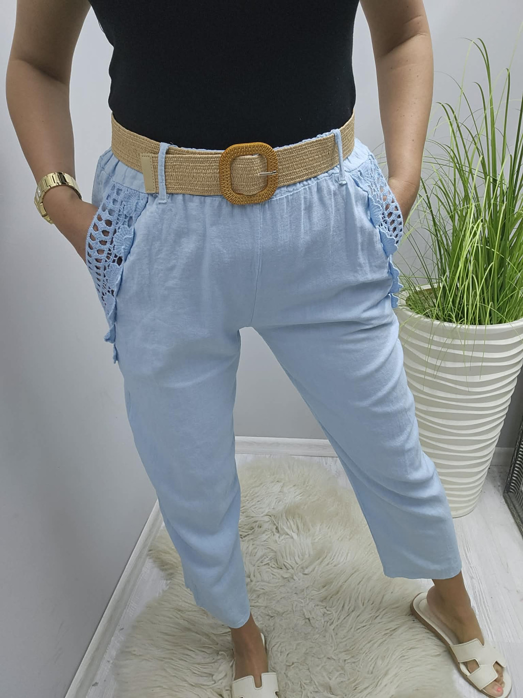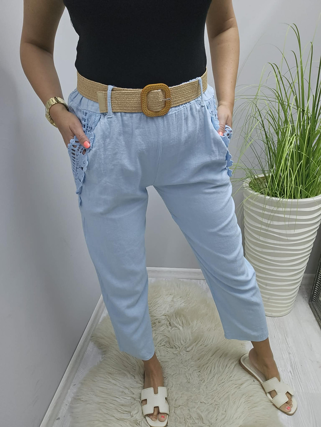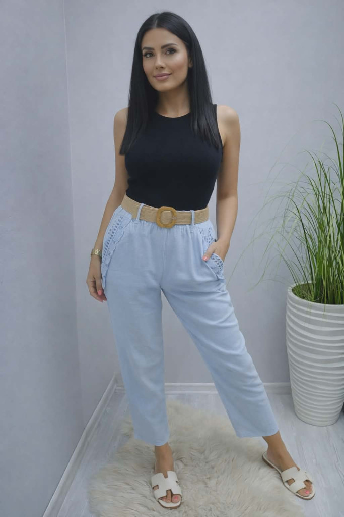 Lenvászon zsebénél csipke szegélyes nadrág övvel (babakék)