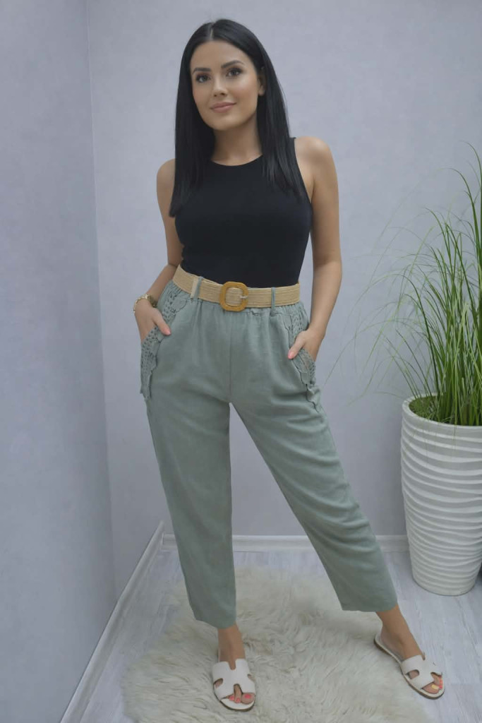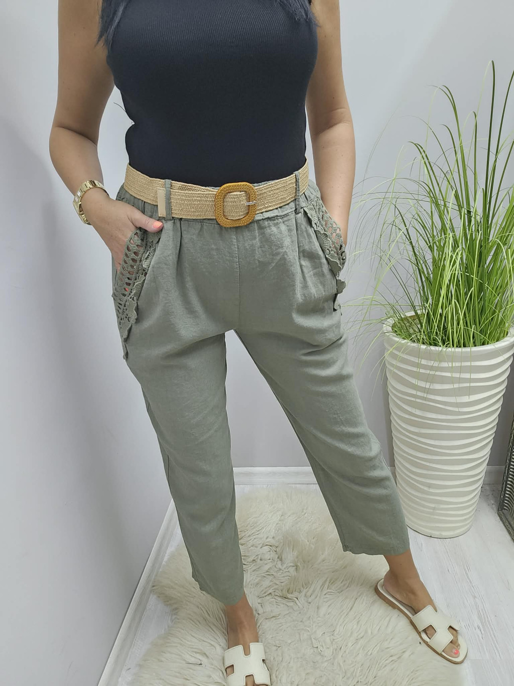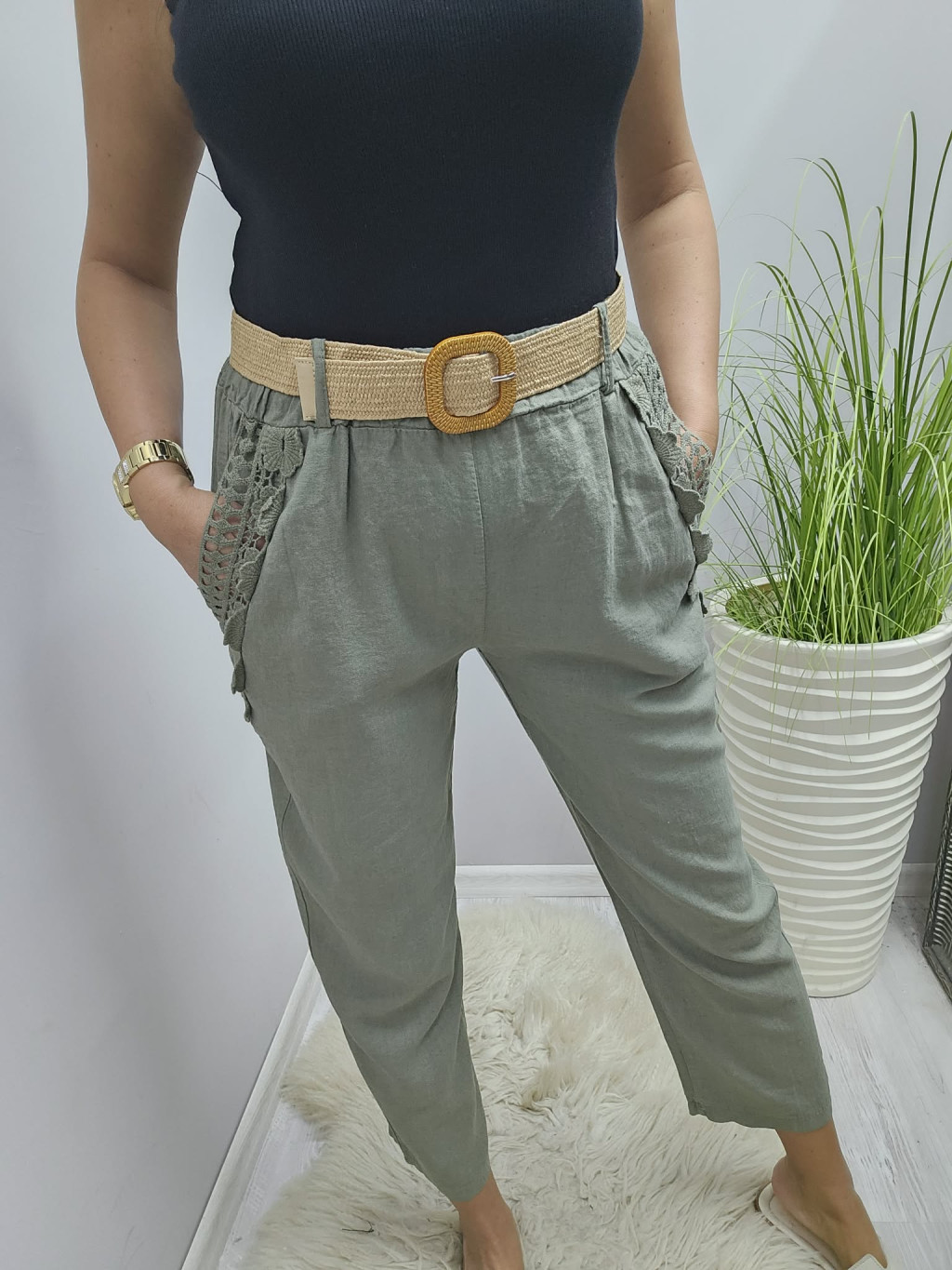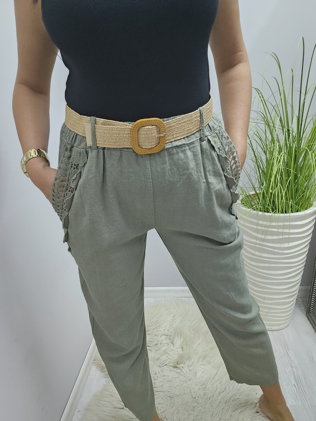 Lenvászon zsebénél csipke szegélyes nadrág övvel (khaki)