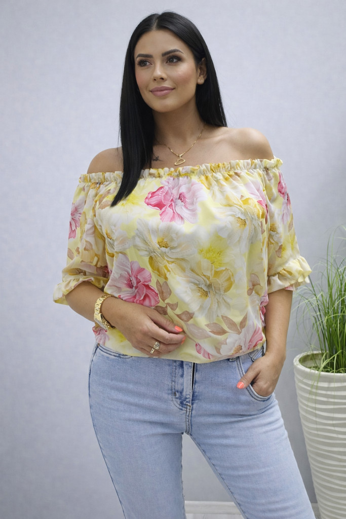 Vállán gumírozott virágmintás blúz (sárga)