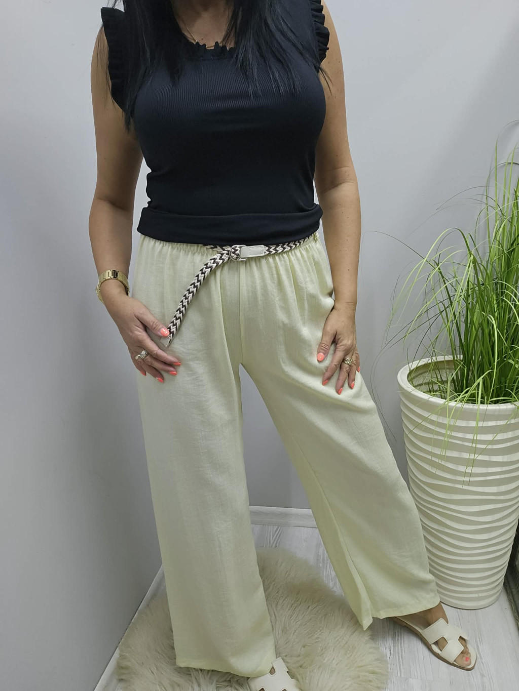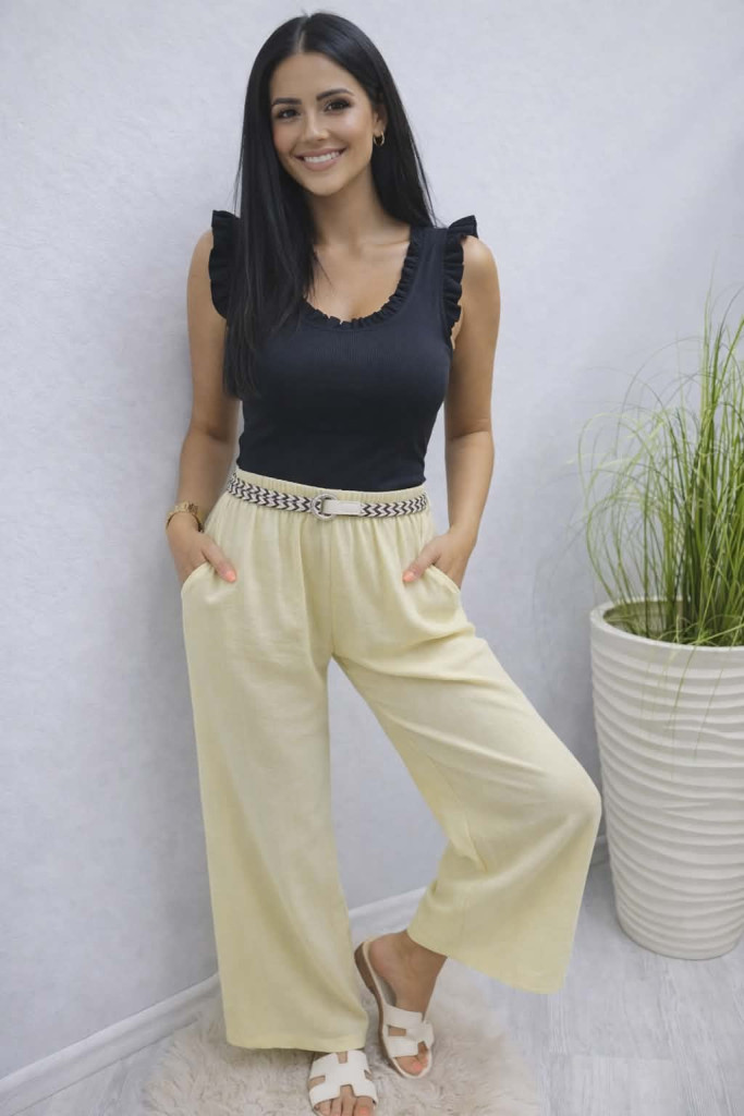 Divatos lenvászon gumis derekú nadrág övvel (sárga)