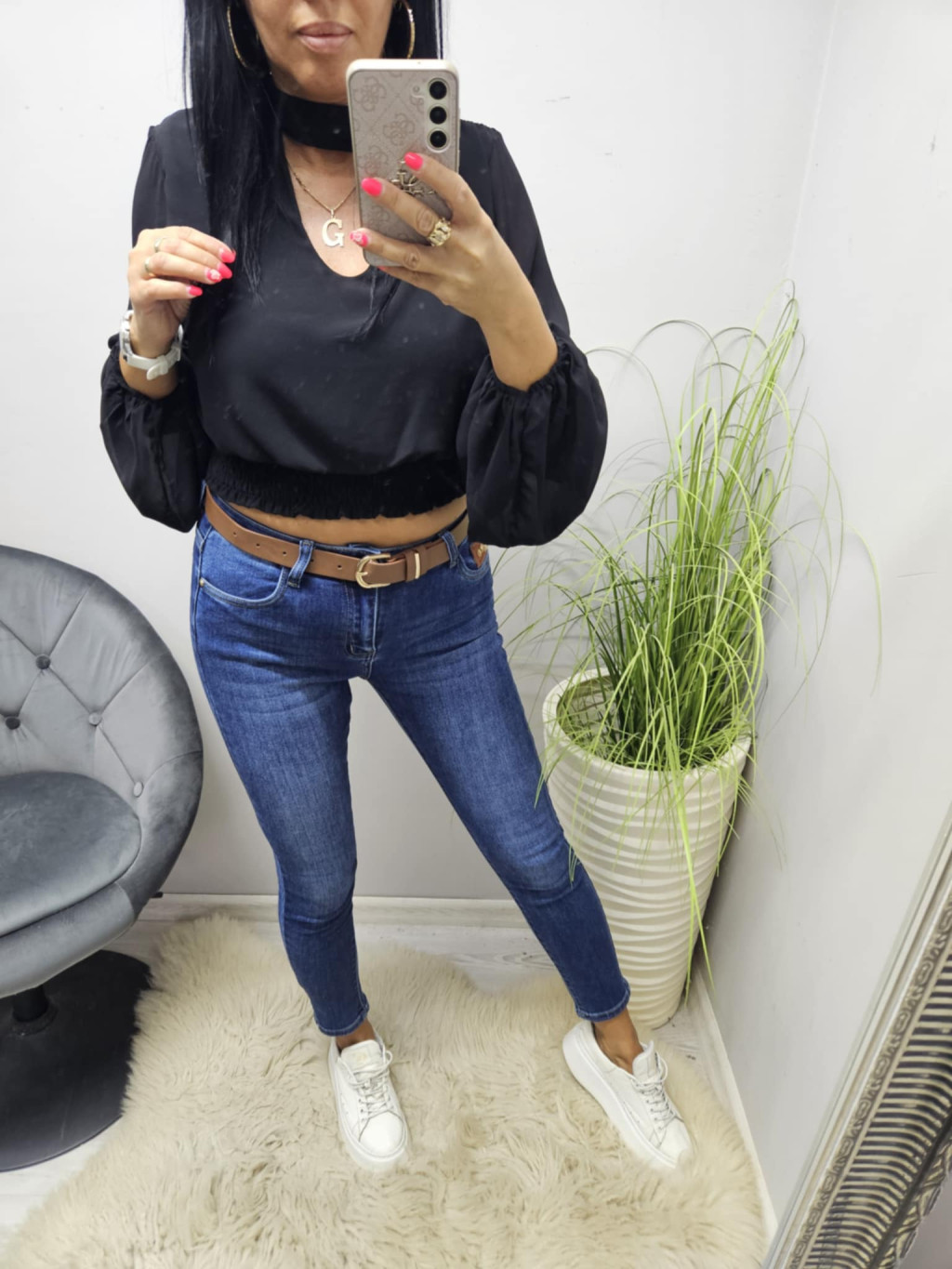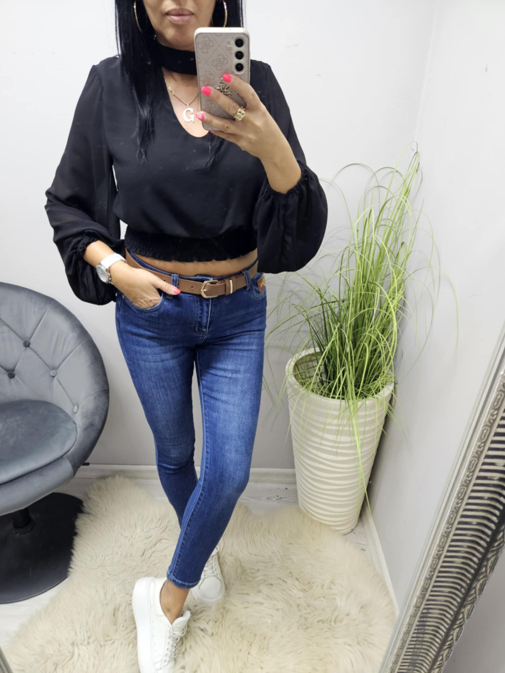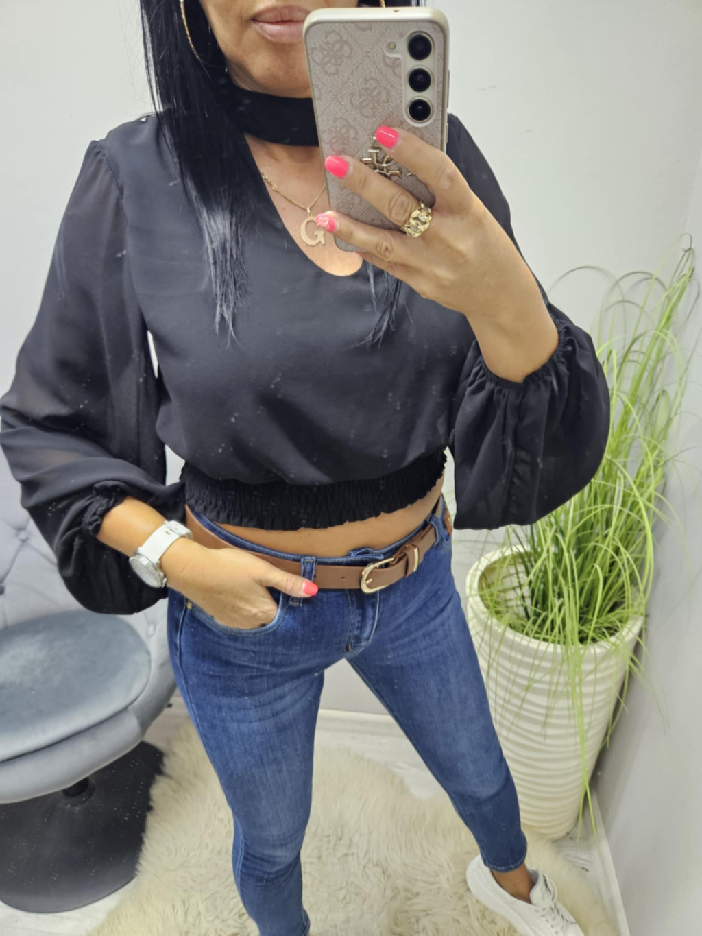 Gyönyörű hátul a nyakánál megköthető alján gumírozott rövid fazonú blúz (fekete)