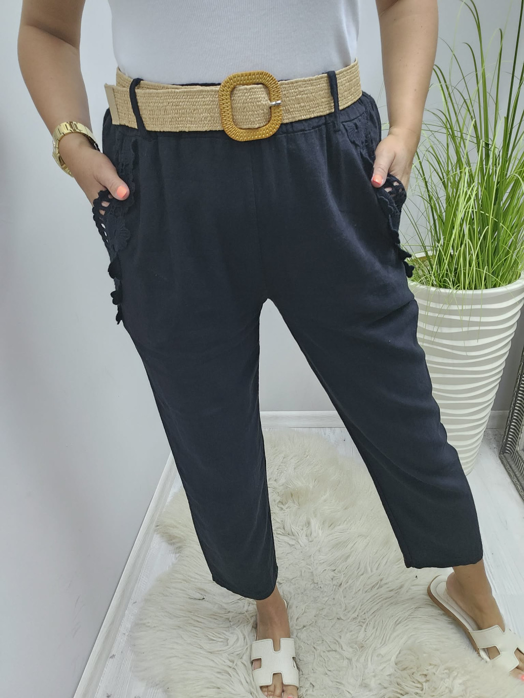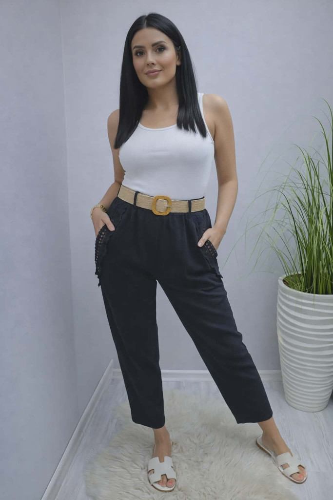 Lenvászon zsebénél csipke szegélyes nadrág övvel (fekete)